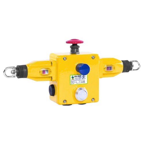 Industrial safety device that shuts down machinery immediately when a tensioned rope along a machine or conveyor is pulled in an emergency.